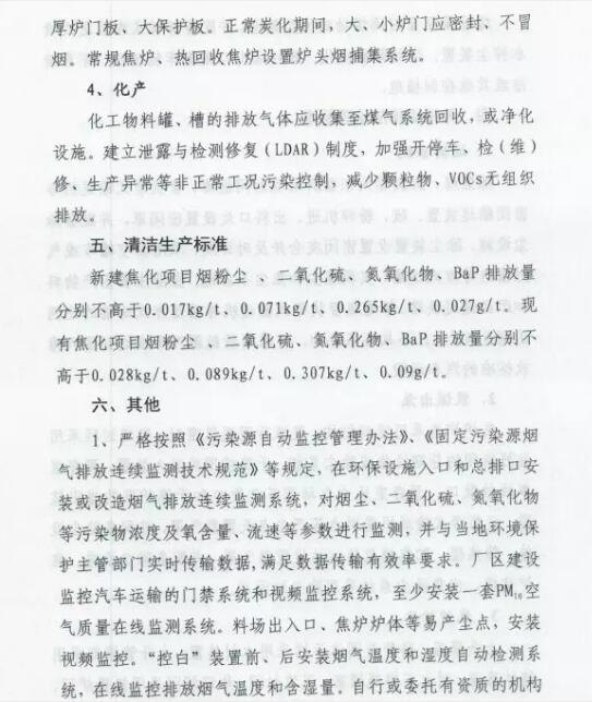 2018年9月底前,全市所有焦化企業全部達到超低排放水平(限值參照驗收標準,通過168小時運行且第三方監測達標,95%以上小時均值排放達標),并完成濕煙氣脫白治理改造,凡達不到標準的實施停產整治
