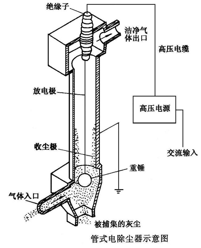 單管電除塵器結(jié)構(gòu)如圖所示。集塵極為150-300mm的圓形金屬管,管長為3-5m。放電極線(電暈線)用重錘懸吊在集塵極園管的中心。管式電除塵器電場強(qiáng)度高且變化均勻,但清灰比較困難。常用于處理含塵氣體量小或含霧滴的氣體。