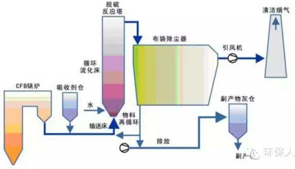 以循環(huán)流化床原理為基礎,通過物料的循環(huán)利用,在反應塔內(nèi)吸收劑、吸附劑、循環(huán)灰形成濃相的床態(tài),并向反應塔中噴入水,煙氣中多種污染物在反應塔內(nèi)發(fā)生化學反應或物理吸附;經(jīng)反應塔凈化后的煙氣進入下游的除塵器,進一步凈化煙氣。此時煙氣中的SO2和幾乎全部的SO3,HCl,HF等酸性成分被吸收而除去,生成CaSO3•1/2H2O、CaSO4•1/2H2O等副產(chǎn)物。