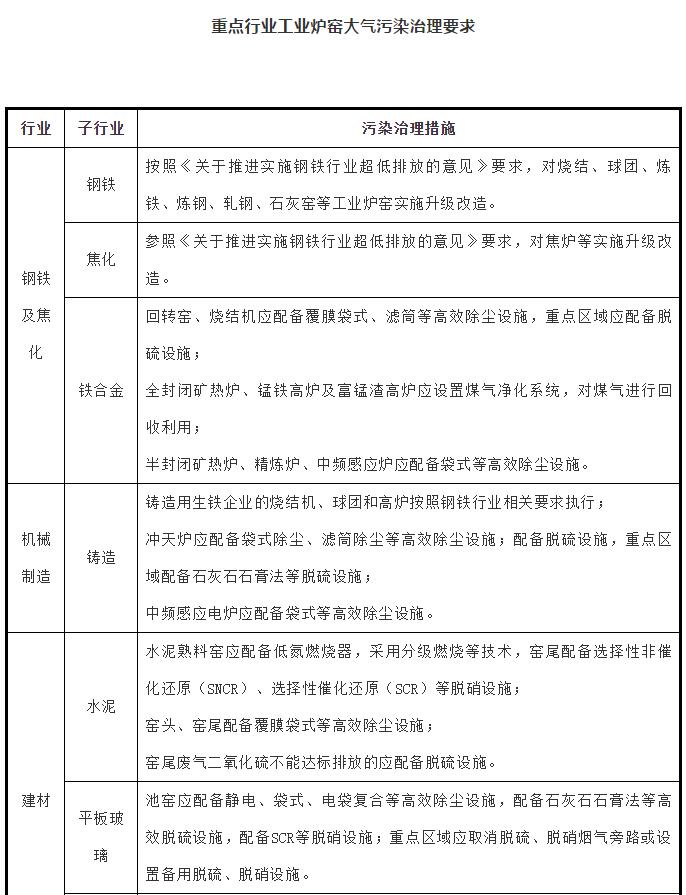 (三)實施污染深度治理。推進工業爐窯全面達標排放。已有行業排放標準的工業爐窯(見附件3),嚴格執行行業排放標準相關規定,配套建設高效脫硫脫硝除塵設施(見附件4),確保穩定達標排放。已制定更嚴格地方排放標準的,按地方標準執行。重點區域鋼鐵、水泥、焦化、石化、化工、有色等行業,二氧化硫、氮氧化物、顆粒物、揮發性有機物(VOCs)排放全面執行大氣污染物特別排放限值。已核發排污許可證的,應嚴格執行許可要求。