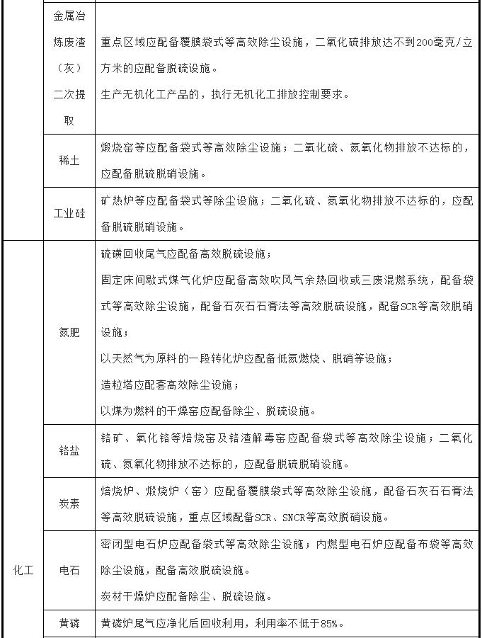 暫未制訂行業排放標準的工業爐窯,包括鑄造,日用玻璃,玻璃纖維、耐火材料、石灰、礦物棉等建材行業,鎢、工業硅、金屬冶煉廢渣(灰)二次提取等有色金屬行業,氮肥、電石、無機磷、活性炭等化工行業,應參照相關行業已出臺的標準,全面加大污染治理力度(見附件4),鑄造行業燒結、高爐工序污染排放控制按照鋼鐵行業相關標準要求執行重點區域原則上按照顆粒物、二氧化硫、氮氧化物排放限值分別不高于30、200、300毫克/立方米實施改造,其中,日用玻璃、玻璃棉氮氧化物排放限值不高于400毫克/立方米;已制定更嚴格地方排放標準的地區,執行地方排放標準。
